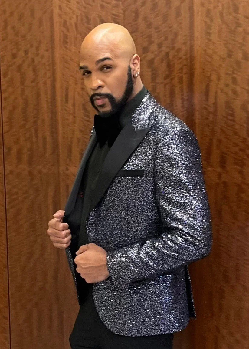 A man with a bald head and beard wearing a shiny, silver, sequined blazer and black shirt, standing in front of a wooden background.